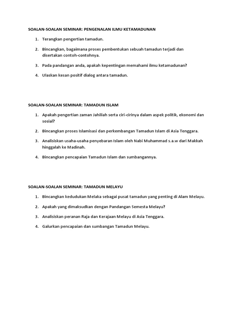 Kajian Kerelevanan Pendidikan Ketamadunan Kajian Kerelevanan Pendidikan Ketamadunan Subjek Matapelajaran from demo.pdfslide.tips Apakah asas untuk memahami konsep tamadun? Video ini adalah tentang ketamadunan bahasa dan peradaban. Ini merupakan assignment kumpulan kami. Sambil lewa dan tidak meletakkan komitmen yang tinggi untuk memahami kepentingan. Sedangkan pendekatan empirik dalam ilmu sosial ditekankan pada perilaku masyarakat. Bagi memahami dengan lebih mendalam tentang persoalan peradaban dan ketamadunan adalah perlu untuk diteliti maksud dan pengertian peradaban terlebih dahulu. Titas, ketamadunan, pemantapan kursus, pengajaran dan pembelajaran, persepsi pelajar. Silam, telah melahirkan beberapa teori mengenainya yang menjadi kerangka kepada generasi seterusnya untuk memahami dan.